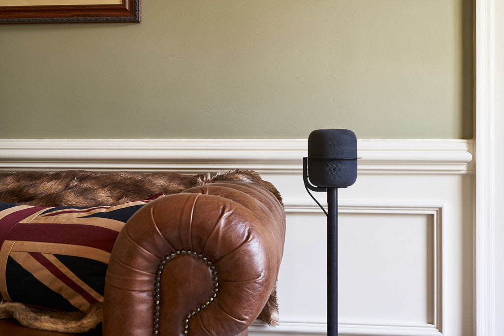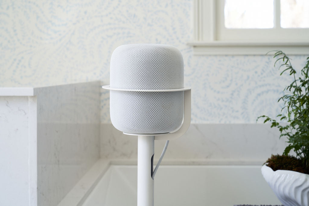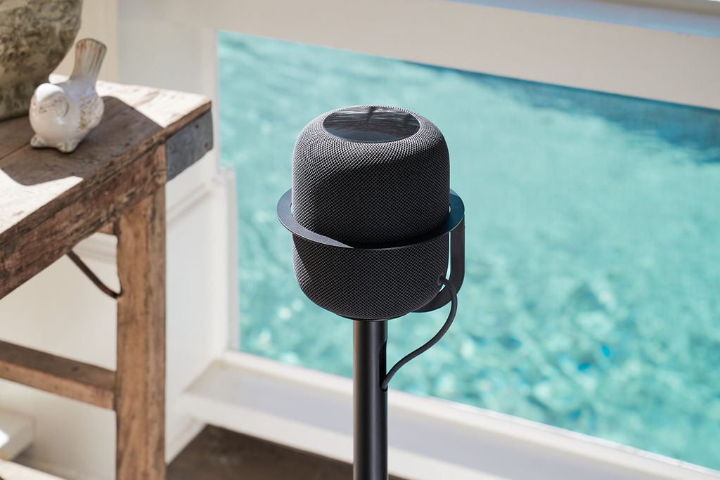 The stand makes it easy to move the HomePod, and the power cable is concealed within the post, so it's less of a trip hazard. Our NoBox engineer placed the rings carefully so they don't block any HomePod speakers or microphones.